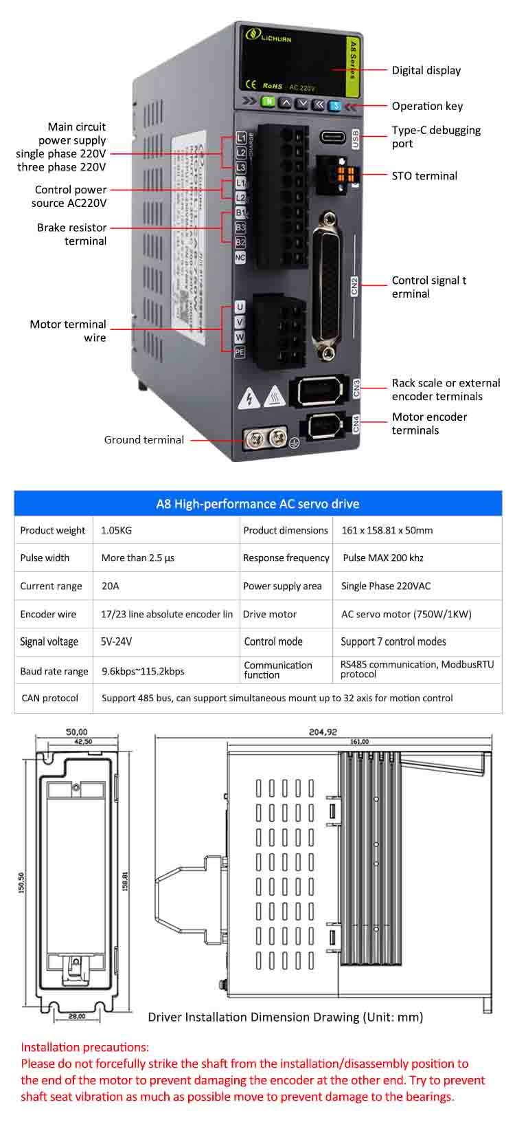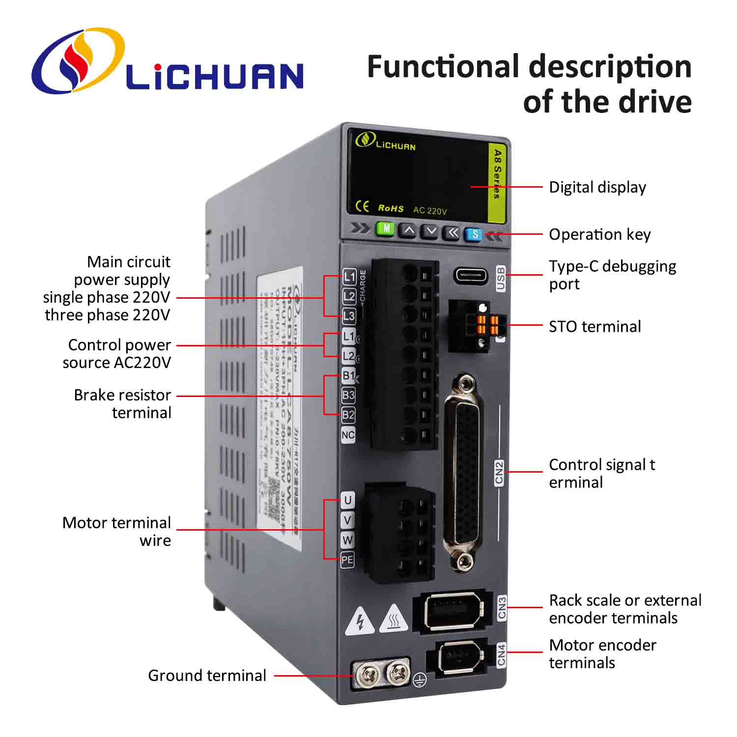 TheLichuan A8 High Accuracy STO ABZ AC servomoottoriohjainsarjasisältää täydellisen servojärjestelmän seuraavilla eritelmillä: