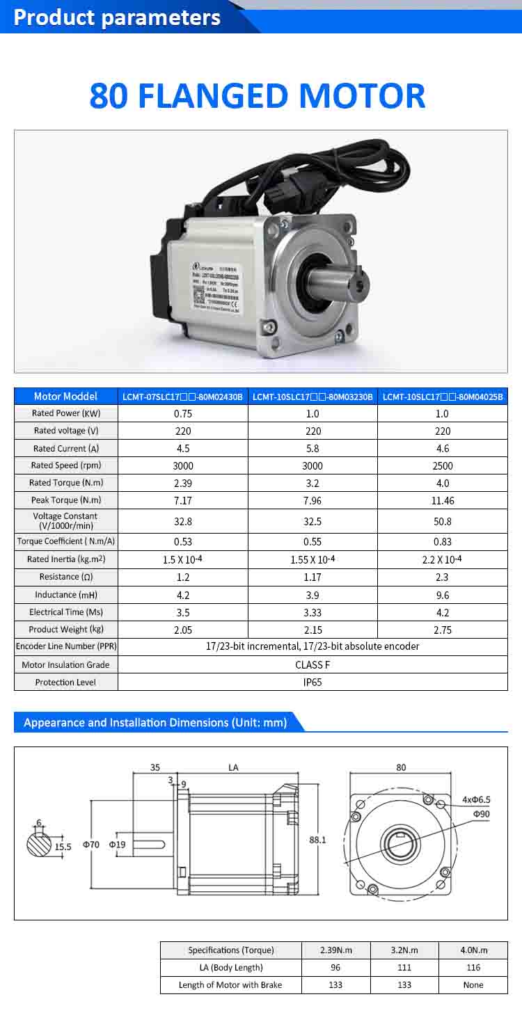 Lichuan AC servomoottoriohjainsarja A8, korkea tarkkuus STO ABZ 750W 0,75KW 2,39N.m 220V 4,5A 2500/3000RPM IP65